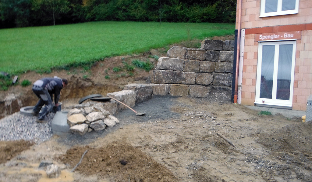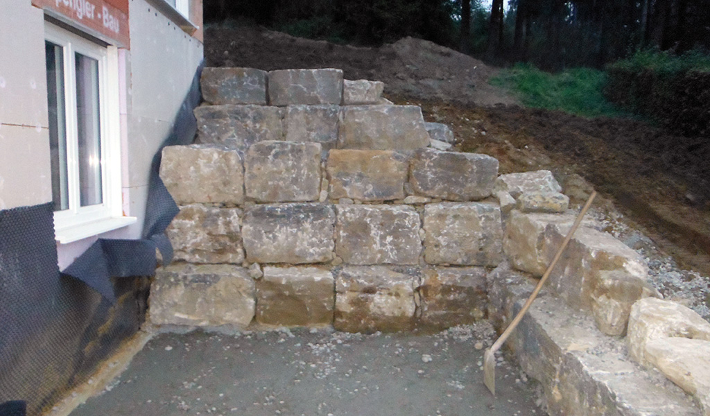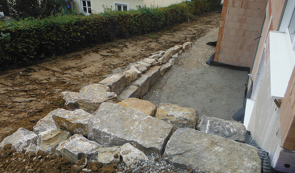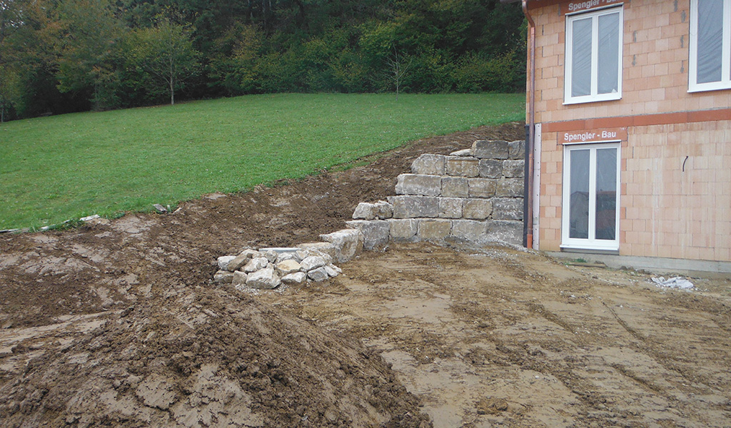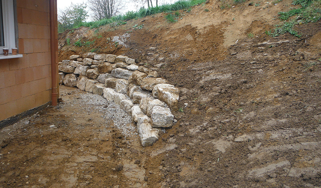 Mauerbau aus Muschelkalkquadern, Mauerbau mit Bruchsteinen, Hangbefestigung