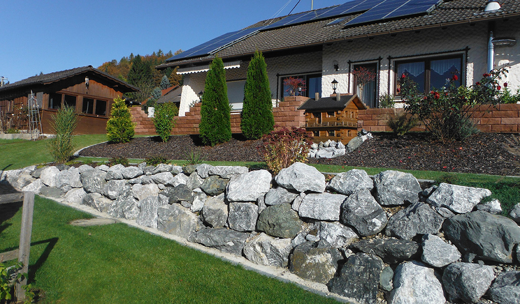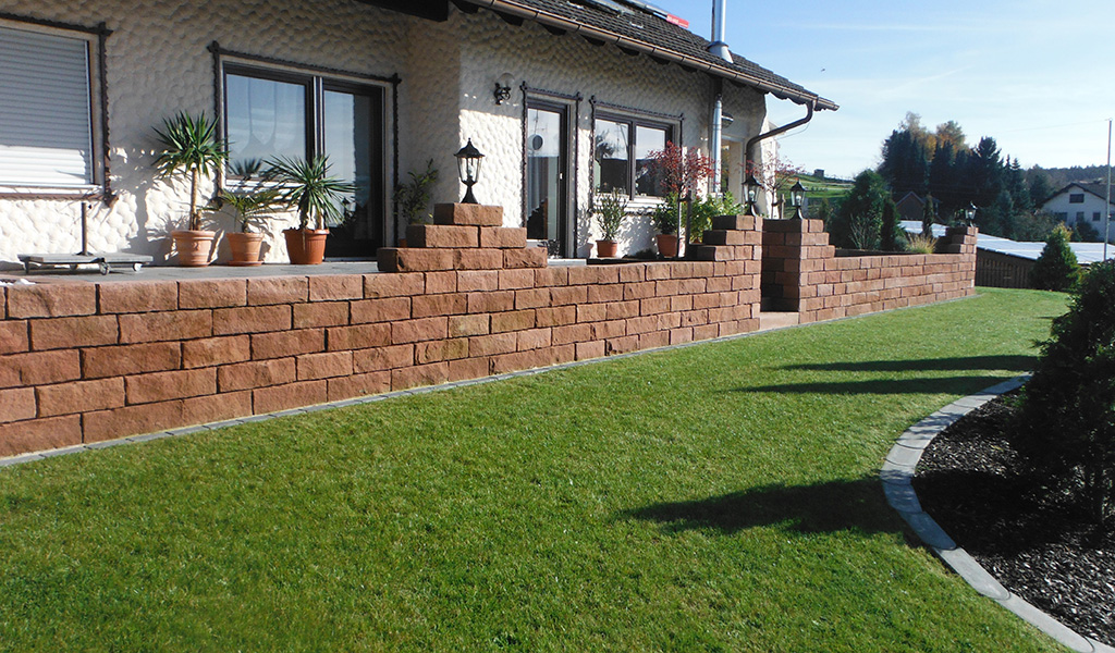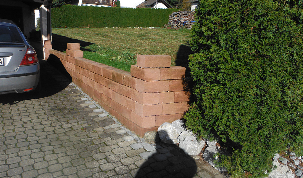 Hofgestaltung und Befestigung mit Klinker, Einfassungen aus Naturstein, Eingangstreppe aus Naturstein, Wasserspiel am Hauszugang