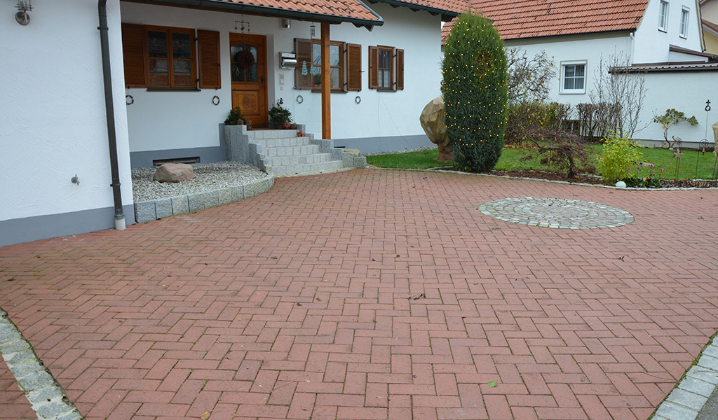 Hofgestaltung und Befestigung mit Klinker, Einfassungen aus Naturstein, Eingangstreppe aus Naturstein, Wasserspiel am Hauszugang