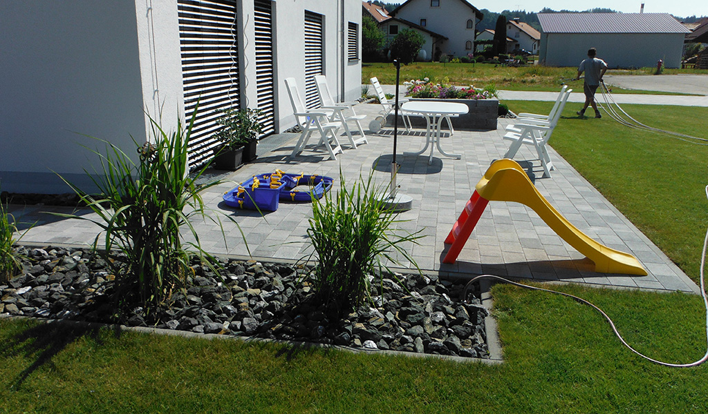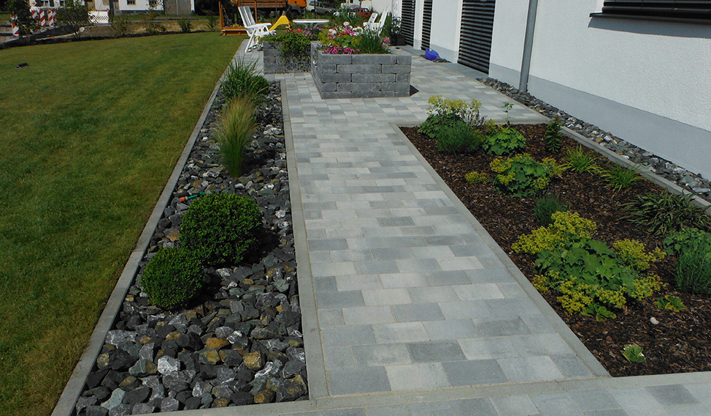 Kompletter Neubau Außenanlagen, Hofeinfahrt und Terrassenflächen, Hochbeete, Flächenplanie